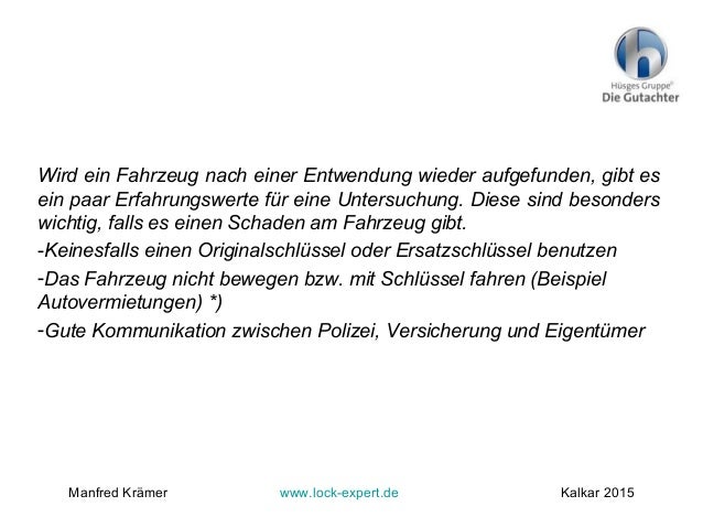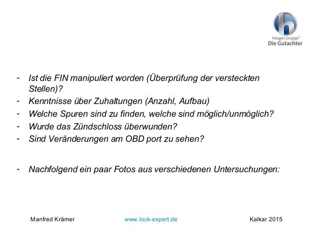 1. Seminar Kalkar 2015 • Schloss – und Schlüsseluntersuchung nach Fahrzeugdiebstahl Manfred Krämer www.lock-expert.de Kalkar 2015